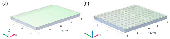 Based on the data from the FeRh sample, geometric models for the conventional and modified FeRh plates were created (Figure 5). The dimensions of the holes and geometric parameters were as close as possible to those of the actual object. As with a real PNIPAM/FeRh composite sample, the thickness of the PNIPAM polymer layer was approximately 20 μm. This model does not account for the inhomogeneity of the holes or their exact geometry. PNIPAM and FeRh parameters were obtained experimentally and from the literature sources and used to simulate heat transfer processes. Physical parameters of FeRh and PNIPAM components, used for modeling was collected in Table 1. Material parameters of the FeRh component used for calculations were taken from experimentally obtained parameters for the Fe49Rh51 sample [24]. The material parameters of the PNIPAM for calculations have been simplified and used based on assumptions that the LCST occurs in aqueous solutions and PNIPAM, as suggested by Zhou et al. [26], which can be assumed to be a thermosensitive liquid with a specific heat capacity of ~4300 J/Kg × K close to water at ~4200 J/Kg × K. These simplifications of the parameters were assumed based on the low mass of the PNIPAM polymer, which was significantly less than the mass of the FeRh plate, which critically does not affect the simulation results. Moreover, the is no significant difference between the density of PNIPAM 1100 kg/m3 and water 1000 kg/m3.