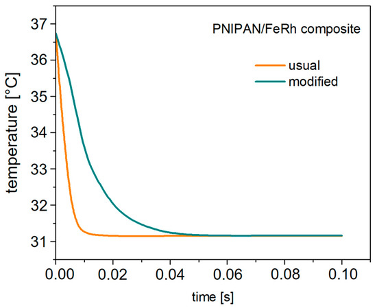 Based on the data from FEM simulations of the studied sample, we carried out simulations of the heat transfer process in both conventional and modified PNIPAM/FeRh composite samples (Figure 6).
