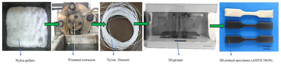 The surface morphology and microstructure of the pure nylon and its composite specimens were analyzed after the tensile test using a CARL ZEISS EVO10 machine (Zeiss Microscopy, LLC, White Plains, NY, USA). To examine the surface morphology of the fractured specimens post-tensile testing, the fracture surfaces were coated with gold via sputter coating.