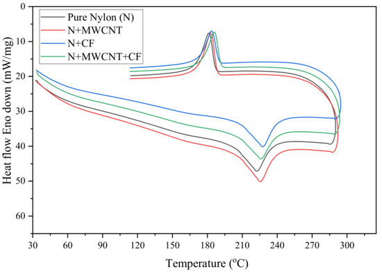 DSC analysis was carried out on pure and reinforced nylon composite specimens in a nitrogen atmosphere using a Perkin Elmer STA 8000, Waltham, MA, USA, from 30 to 300 °C at a temperature rise of 10 °C per minute, and a 300 to 30 °C cooling ramp at 10 °C per minute was performed.