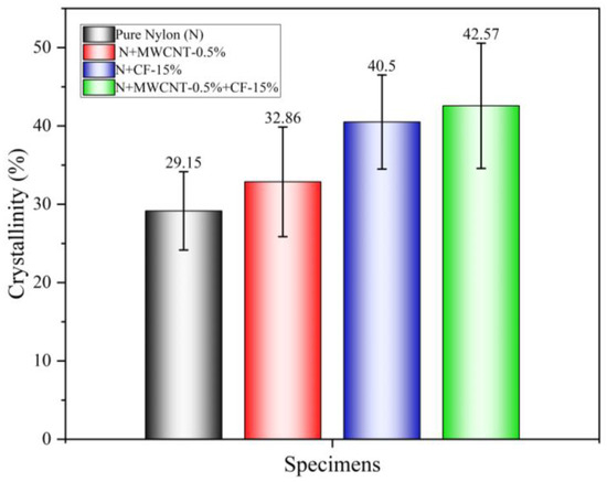 Furthermore, the heat of fusion, indicative of a polymer’s crystallinity, is determined by integrating the area under the melting temperature (Tm) peaks in DSC curves. For nylon (PA6), the heat of fusion for a 100% crystalline sample is reported as 188 J/g [26,28]. This value serves as a reference to calculate the weight percentage crystallinity of both virgin PA6 and its composites, such as those reinforced with MWCNTs, CF, or a combination of both, as shown in Figure 3. The degree of crystallinity (Xc) of a polymer can be calculated using the following Equation (3):