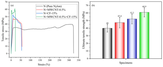 (a) Tensile stress–strain curves (b) Ultimate tensile strength of nylon and its composites.