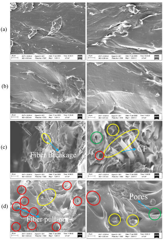 To understand the underlying mechanisms of reinforcement effects on the mechanical properties of the polymer composite, fractography analysis was performed. Figure 5 presents SEM micrographs of the fractured surfaces of pure nylon and its composites after tensile testing. Figure 5a shows the fractured surface of pure nylon, characterized by a rough texture with visible fractures and irregularities. On the other hand, Figure 5b reveals significant changes in the fracture surface topography of the nanocomposite, showing that the presence of functionalized MWCNT promotes the polymer’s interfacial adhesion thereby enhancing the mechanical properties by improving load transfer and stress distribution within the nanocomposite. Furthermore, Figure 5c,d depict CF stacked with nylon, exhibiting good distribution within the matrix. This uniform distribution contributes to improved mechanical properties and also plays a critical role in enhancing the interlaminar fracture toughness of the composite. Failure mechanisms such as debonding, fiber breakage, and fiber pull-out are observed in the samples.