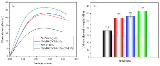 (a) Flexural stress–strain and (b) ultimate flexure stress of nylon and its composites.