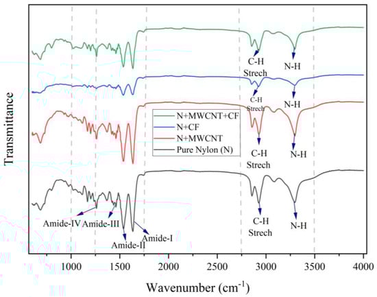 The incorporation of 0.5 wt.% MWCNT into the nylon matrix results in a slight increase in the intensity of the N–H at 3296 cm−1 and Amide I peaks at 1534 cm−1 compared to pure nylon. This suggests interactions between the MWCNT and the nylon matrix, likely due to hydrogen bonding or physical interactions, which restrict chain mobility and enhance the structural stability of the polymer. In contrast, the addition of 15 wt.% CF leads to a slight reduction in the intensity of the Amide I and N–H peaks. This decrease in peak intensity indicates a partial disruption of hydrogen bonding within the matrix, likely caused by the fiber–matrix interactions [14,31,32]. Furthermore, the hybrid combination of MWCNT and CF demonstrates a partial recovery in the intensity of the N–H stretching peak compared to the CF-only composition. This suggests that the reinforcing effect of MWCNT partially counteracts the disruption caused by CF, contributing to improved structural retention in the hybrid system.