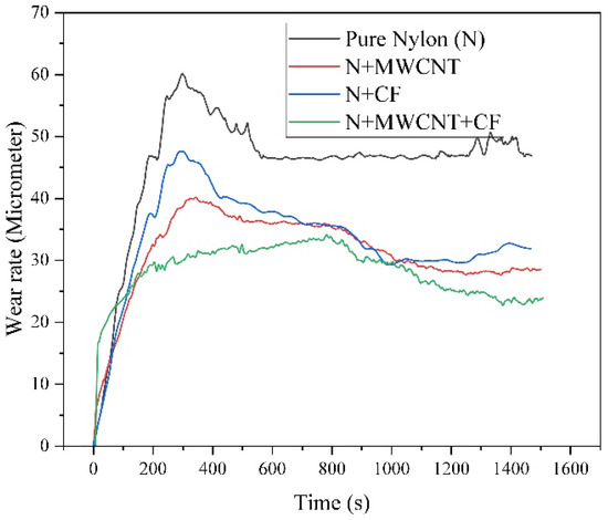Similarly, the nylon composite reinforced with 15 wt.% CF exhibits an even lower wear rate of approximately 30 μm, demonstrating a substantial improvement in wear resistance. This enhancement is due to the strong load-bearing structure provided by carbon fibers, which reduces surface wear and improves resistance to deformation. Furthermore, CF acts as a reinforcing agent, lowering friction and minimizing abrasive wear [33,34]. Notably, the hybrid combination of both MWCNT and CF yields the best results, with wear rates stabilizing at around 10 to 15 μm. This substantial enhancement in performance suggests that the synergistic effect of MWCNT and CF significantly improves the tribological properties of nylon composites. The transition to a steady state, observed around 400 s, indicates that the composites stabilize with minimal fluctuations in wear rate.