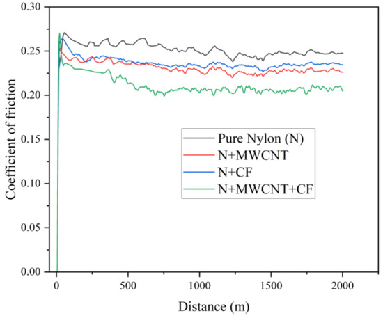 Figure 9 illustrates the variation of the COF with distance for pure nylon and its composites. Initially, all specimens exhibit a sharp peak in COF before stabilizing, reaching equilibrium after approximately 500 m of sliding distance. Pure nylon (N) shows the highest COF, with a static COF of 0.271 and a stabilized kinetic COF of 0.238. The addition of MWCNT significantly reduces both static and kinetic COF to approximately 0.253 and 0.220, respectively, making it the most effective in lowering friction. The inclusion of CF results in a slightly lower COF than pure nylon, with static and kinetic values around 0.264 and 0.226, respectively. The CF content in the nylon composite further reduces the COF compared to pure nylon, likely due to CF’s unique structure. As a graphitized carbon, CF has hexagonal planes aligned perpendicular to the fiber axis, which is believed to contribute to friction reduction when sliding against steel [35]. Meanwhile, the combination of MWCNT and CF yields an intermediate COF, with static and kinetic values of 0.270 and 0.199, respectively, due to the synergetic effect of MWCNT and CF.