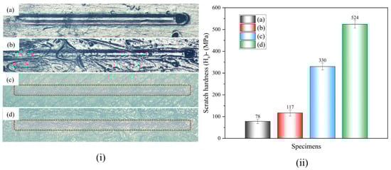 Vickers hardness (i) Scratch indentation, (ii) Scratch hardness (Hs) values of: (a) Pure nylon (N), (b) N+MWCNT, (c) N+CF, and (d) N+MWCNT+CF.