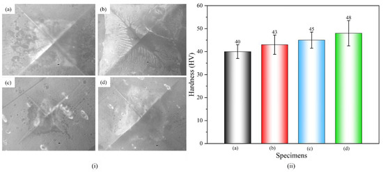 Vickers hardness (i) Indentation marks, (ii) Hardness values of: (a) Pure nylon (N), (b) N+MWCNT, (c) N+CF, and (d) N+MWCNT+CF.