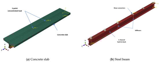 Eight-node linear brick elements with reduced integration (C3D8R) was used to simulate the concrete slabs. This element is capable of cracking in tension and crushing in compression. It can easily represent the nonlinear behavior of concrete. The CFS beams, stiffeners, and L-shaped shear connectors were modeled using a four-node doubly curved shell element with reduced integration, finite membrane strains, and hourglass control (S4R) [41,42]. Two-node linear 3D truss elements were used to model the reinforcing rebars (T3D2). The coupling option in ABAQUS/CAE was used to apply loads to the concrete slab’s top. With one end of the beam fixed as a hinge and the other end supported by a roller, displacement control was used to simulate the applied loadings. Figure 1 illustrates the assembled model after meshing.