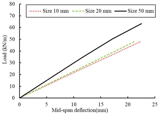 To obtain accurate results, mesh with different sizes were investigated using three distinct mesh sizes of 50 mm, 20 mm, and 10 mm. The load–deformation responses were used as the factor in choosing the more reasonable mesh size. The mesh was considered to have converged when an increase in mesh density had no impact on the outcomes. The convergence investigation demonstrated that both the 20 mm and 10 mm mesh sizes converged as shown in Figure 2. By considering the amount of computing time, 20 mm mesh size was chosen. Noteworthy, finer mesh sizes were used at the round corners.