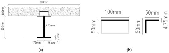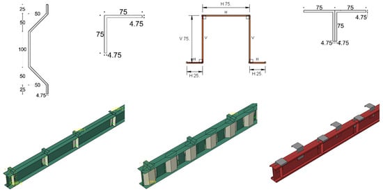 Two different configurations of shear connectors were used to investigate the effect of the interaction between the concrete slab and CFS beams, as shown in Figure 10. Group 1 sheer connectors, which include L-shaped shear connectors with 4.75 mm thickness, 50 × 50 mm cross-section dimensions, and 100 mm length, were positioned on the upper flange of the CFS beams. Group 2 sheer connectors, which include L-shaped shear connectors with 2.00 mm thickness, 170 × 100 mm cross-section dimensions, and 100 mm length, were investigated.