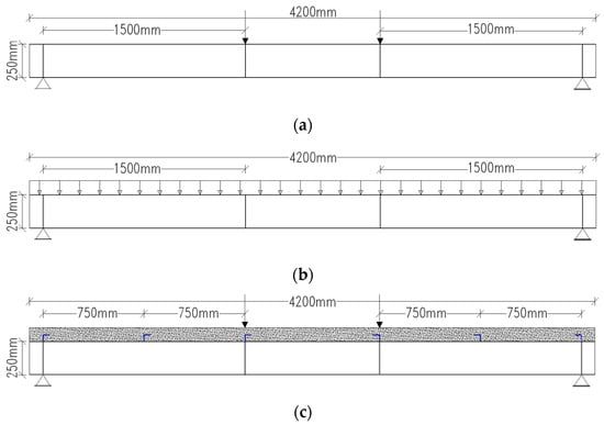 Loading schemes of the tested beams by Malite [43]. (a) Specimen VA1; (b) Specimen VA2; (c) Specimen VA3.