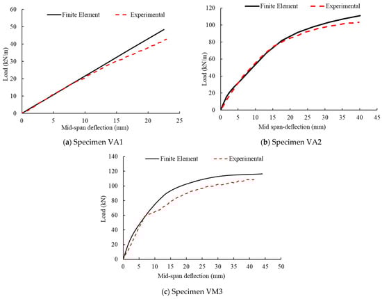 The numerical results in terms of deflection, strains, and modes of failure of the analyzed beams were verified against the experimental results, as shown in Figure 5, Figure 6 and Figure 7. Figure 5 presents comparisons between the FE and experimental results for the load versus mid-span deflection of specimens VA1, VA2, and VM3. The experimental curve shows slightly lower load values than the FE predictions for the same deflection. The FE and experimental results initially matched well but diverged at larger deflections. The FE model predicted a slightly higher load-carrying capacity compared to the experiment. Idealized material properties, slight variations in supports and loading, and imperfections could explain this difference in behavior.