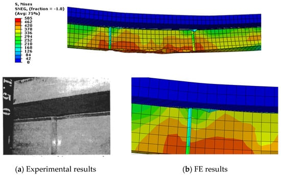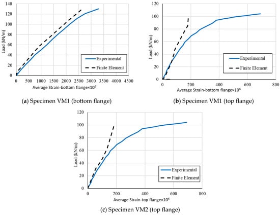 Figure 6 presents a comparison of load–strain curves between experimental results and FE simulations for beam specimens VM1 and VM2 at different flange locations. The FE strains tend to predict a stiffer response at lower strain levels but diverge from the experimental data as strain increases. In all cases, the FE model underestimates deformation at the early stages but overestimates stiffness at later stages. This suggests that the numerical model may not fully capture material nonlinearities, residual stresses, or imperfections present in the real specimens. Moreover, the material properties, boundary conditions, and element discretization could explain this difference in behavior. The disappearance of FE data in the final stage of the load–strain curves (Figure 6) is due to numerical convergence issues in ABAQUS.