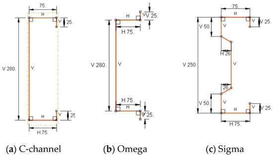 C-channel, omega, and sigma cross-sections, as shown in Figure 8, with identical depths, areas, and lengths were investigated to capture the capacity and behavior of composite beams with different CFS sections.