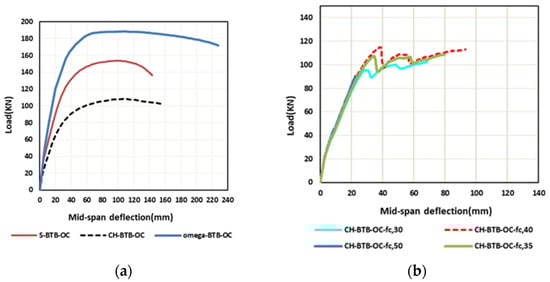 Effect of the CFS beam cross-section and concrete compressive strength. (a) Effect of the CFS beam cross-section (C, omega, and sigma cross-sections); (b) Effect of the concrete compressive strength.