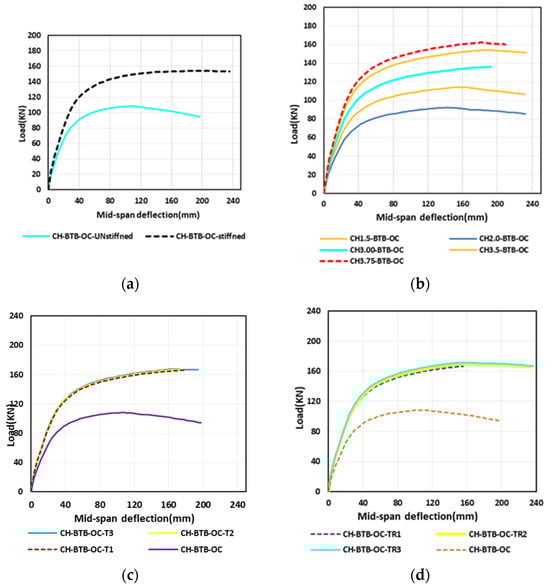 The load–deflection curves analyzing the effect of different design parameters on structural performance. (a) Effect of stiffened and unstiffened CFS sections; (b) Effect of the C-channel thickness; (c) Effect of thickness of the T-section stiffener; (d) Effect of thickness of the TR-section stiffener.