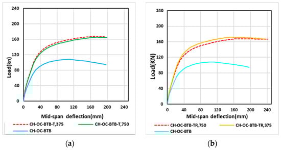 Figure 13 presents load–deflection curves analyzing the influence of stiffener spacing for T-section stiffeners and TR-section stiffeners. The beams CH-OC-BTB-T,375 and CH-OC-BTB-T,750 corresponded to different stiffener spacings (375 mm and 750 mm, respectively). Both stiffened models exhibited higher load capacities and reduced deflections compared to the unstiffened beam (beam CH-OC-BTB). The 375 mm T-section stiffener spacing showed a slightly higher peak load and stiffness than the 750 mm spacing (see Figure 13a), suggesting that closer stiffener spacing enhances beam performance by providing better local reinforcement. A similar behavior was observed with TR-section stiffeners with 375 mm and 750 mm spacing, as shown in Figure 13b. Both stiffened models outperformed the unstiffened beam (CH-OC-BTB), confirming the effectiveness of stiffeners in enhancing load capacity and reducing deflection.