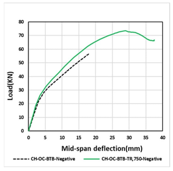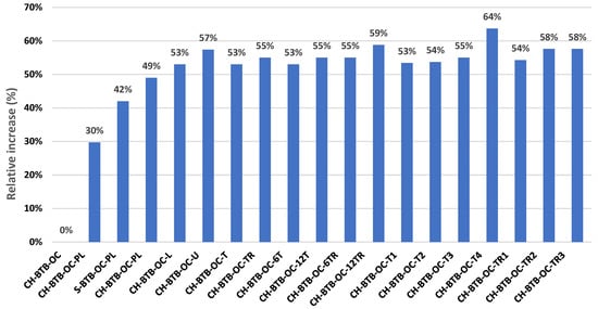 Figure 16 presents the relative increase (%) in load capacities of various analyzed beams from Group 1. The beam CH-BTB-OC beam served as the reference (0% increase). The beams CH-BTB-OC-PL, S-BTB-OC-PL, and other variations exhibited significant improvements. The beam CH-BTB-OC-TR4 showed the highest enhancement (64% increase). Most configurations achieved a greater than 50% increase, indicating effective reinforcement strategies. Beams with TR tend to have higher increases. Variations like OC-L, OC-U, and OC-T exhibited similar performance, around 53–57%. The smallest increase was seen in the S-BTB-OC-PL configuration at 30%.