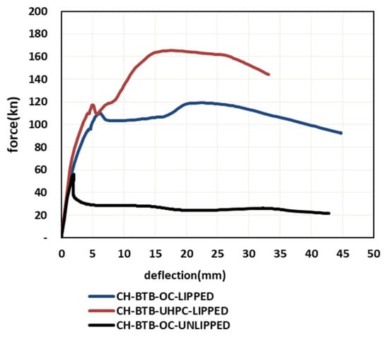 Figure 14 and Figure 15 compare the structural performance of CFS composite beams under negative loading conditions. Figure 14 presents a load versus mid-span deflection curve for two types of CFS beams: unstiffened and stiffened. The stiffened beam (CH-OC-BTB-TR-750-Negative) exhibited a higher load-carrying capacity and greater ductility compared to the unstiffened beam (CH-OC-BTB-Negative). The load increased steadily for both cases, but the stiffened beam maintained higher resistance before experiencing a reduction in load capacity. The results suggest that stiffening enhances strength and deflection capacity under negative loading. Figure 15 illustrates force versus deflection curves for different CFS cross-sections with UHPC and OC. The specimen CH-BTB-UHPC-LIPPED showed the highest force resistance, demonstrating that using UHPC with lipped sections significantly enhances performance. The beam CH-BTB-OC-LIPPED represented a lipped section with OC, which performed better than the beam CH-BTB-OC-UNLIPPED, but lower than UHPC. The unlipped section exhibited the lowest load capacity and failed at a lower deflection, indicating that lipping enhanced strength and ductility.