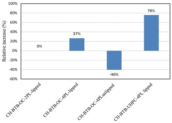 Figure 17 presents the load capacities of different analyzed beams in Group 2. CH-BTB-OC-2PL-lipped shows a 0% relative increase. This specimen was designated as the baseline reference for the comparison in Group 2. CH-BTB-OC-4PL-lipped exhibited a 27% increase in load capacity compared to the reference, indicating that the additional stiffeners contributed positively to structural performance. CH-BTB-OC-4PL-unlipped experienced a 40% decrease in load capacity. Beam CH-BTB-UHPC-4PL-lipped demonstrated the highest improvement with a 76% increase in load capacity, implying that the use of UHPC in combination with 4PL stiffeners enhanced beam strength.