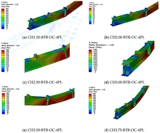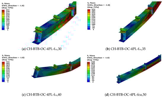 Figure 18 illustrates the failure modes of the CH-BTB-OC-4PL beams under different concrete compressive strengths (fcu values of 30, 35, 40, and 50 MPa). The results in terms of von Mises stress distribution highlight regions of high stress concentration and potential buckling failure. The stress concentration was highest in the compression flange and web, leading to local buckling in these regions. As fcu increased, the stress distribution shifts, and failure became more localized. For a concrete strength of 300 MPa, a more distributed stress pattern with moderate stress in the compression flange was exhibited. Slightly higher stress concentrations appeared in the compression zone in the case of fcu = 350 MPa. Local buckling became more pronounced in the cases of fcu = 400 and 500 MPa, indicating that increasing fcu led to a more brittle failure mode. The stress intensity in the flange and web increased.