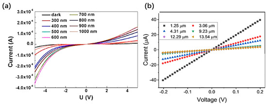 (a) The I-V characteristics of a Bi2S3-based photodetector with Au contacts. Reprinted with permission from Ref. [70]. Copyright 2020, The Royal Society of Chemistry. (b) The I-V characteristics of a MoNx-based photodetector with Cr contacts. Reprinted with permission from Ref. [71]. Copyright 2021, American Chemical Society.