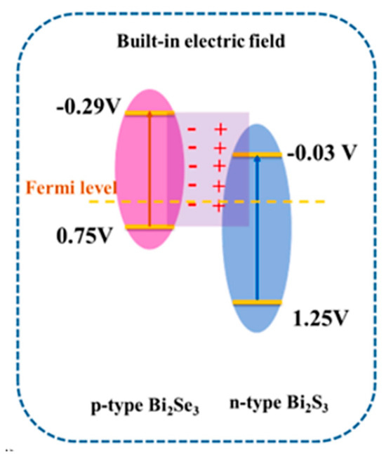 The formation of built-in electric fields originates from carrier diffusion dynamics and space charge redistribution driven by Fermi-level gradients across p-n heterojunctions, culminating in thermodynamic equilibrium through band potential alignment and field stabilization [79,80]. As shown in Figure 3, when p-type Bi2Se3 and n-type Bi2S2 come into contact, electrons diffuse from the n-type (higher Fermi level) to the p-type (lower Fermi level) region, while holes diffuse in the opposite direction due to the Fermi-level mismatch. This process generates a space charge region proximal to the interface: positively charged donor ions are immobilized within the n-region, while negatively charged acceptor ions localize in the p-region. Thermodynamic equilibrium is established upon Fermi-level alignment across the interface, culminating in a stabilized built-in electric field [81,82].