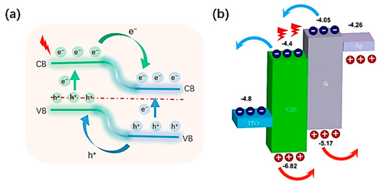 (a) Mechanism of charge separation under illumination, (b) energy band diagram of n-CdS nanorods/p-Si heterojunction. Reprinted with permission from Ref. [86]. Copyright 2023, Elsevier.