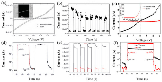 A ZnS NWs-based photodetector: (a) The I-V curves in the dark and under UV irradiation; the inset is an SEM image of the device. (b) The multiple switching of light and dark current. Reprinted with permission from Ref. [130]. Copyright 2016, Elsevier. ZnS NTs-based devices: (c) I-V curves; (d) the natural logarithmic plot of the time response spectrum. Reprinted with permission from Ref. [131]. Copyright 2017, IOP Publishing. (e) The I-T curve for on/off switching; (f) a single on/off cycle. Reprinted with permission from Ref. [132]. Copyright 2016, Springer Nature.