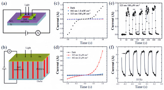 Device schematic: (a) ZnS NWs-based; (b) ZnS NWA-based; (c) I-V curves of (a) in dark and under 325 nm and 442 nm illumination; (d) I-V curves of (b); (e) time response at 325 nm for device (a) with 60 s switching period 60 s and 100 μW cm−2 power; (f) time response at 325 nm for device (b) with 3.9 mW cm−2 power density and 10 Hz pulse. Reprinted with permission from Ref. [133]. Copyright 2012, The Royal Society of Chemistry.