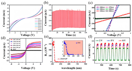 Nanostructured ZnS with atomic-level crystallinity and mitigated compensated defect pairs manifests a highly insulating nature, thereby imposing critical constraints on its optoelectronic device integration capabilities. Strategic doping emerges as an effective approach to modulate these properties, as demonstrated by Saeed et al. [134] through their hydrothermal synthesis of Mn2+-doped ZnS nanorods (NRs). The team fabricated UV photodetectors by integrating silver electrode networks via radio-frequency magnetron sputtering. Doping-induced bandgap narrowing (3.46 eV vs. 3.77 eV for pristine ZnS) extended the spectral response while maintaining visible-blind UV selectivity. As shown in Figure 7a, the device exhibited a 310 nm UV-triggered photoresponse with 1.8 A W−1 responsivity and 719% external quantum efficiency at 0.1 V bias under 0.5 W cm−2 illumination. Figure 7b demonstrates the time-dependent photoresponse characteristics of the UV photodetector. The photocurrent maintained remarkable stability, with an average value of 145.5 μA over hundreds of illumination cycles. Upon UV light termination, the photocurrent rapidly decayed to its low-current state, indicating excellent repeatable stability under operational conditions. The device achieved fast response dynamics (rise/decay times of 16 ms/1.1 ms), with this enhancement attributed to Mn2+-induced surface dangling bonds that accelerated carrier recombination through defect-mediated pathways. Additionally, Jiang et al. [135] synthesized n-type Al-doped ZnS nanowires through thermal co-evaporation, with indium tin oxide (ITO) electrodes deposited via pulsed laser deposition (PLD) to fabricate photodetector devices. As demonstrated in Figure 7c, these devices exhibit wavelength-dependent photocurrent enhancement under 100 mW cm−2 illumination, achieving UV-region detection currents equivalent to visible-range dark current magnitudes. At optimized Al doping (ZnS:Al = 10:1 molar ratio) under 5 V bias with 254 nm illumination (300 mW cm−2), the detectors demonstrated record responsivity (3.1 × 106 A W−1) and photoconductive gain (1.5 × 107). Their enhanced performance stems from two synergistic mechanisms: (1) Surface-band bending, promoting the spatial separation of photogenerated carriers. (2) Aluminum dopants acting as hole-trapping sites, suppressing carrier recombination and extending lifetime (t ≈ 445 s). While exhibiting prolonged response times (tr = 153 s, tf = 445 s) compared to their Mn2+-doped counterparts, attributed to delayed hole release from Al-induced trapping sites, the exceptional UV responsivity and gain characteristics of these detectors compensate for the temporal limitations in their non-switching detection applications.