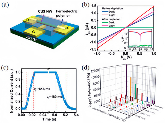 Ferroelectric side-gating single CdS NW-based PD: (a) Schematic, (b) I-V characteristics before and after depletion by ferroelectric polymers in dark and under UV irradiation (375 nm, 18 mW cm−2), (c) time-resolved optical response of device at 1 V. Reprinted with permission from Ref. [148]. Copyright 2016, Wiley-VCH Verlag. (d) Responsiveness of CdS NRs-based PDs in unconditioned conditions. Reprinted with permission from Ref. [149]. Copyright 2017, John Wiley and Sons.