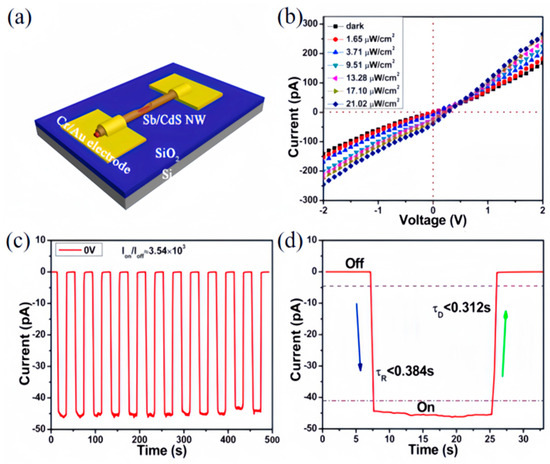 Self-powered photodetectors, capable of achieving optoelectronic conversion and detection without an external power supply, demonstrate significant potential for energy-efficient applications. Chai et al. [150] synthesized core–shell Sb/CdS nanowires through a two-step chemical vapor deposition (CVD) process, and the device architecture is illustrated in Figure 10a. The single NW-based PDs were prepared by photolithography, thermal evaporation, and stripping processes at both ends of a single NW on a Si/SiO2 substrate in order to construct Cr/Au source/drain electrodes. The device boasts superior photocurrent performance, and Figure 10b presents the increasing photocurrent and built-in open-circuit voltage with rising light intensity at different light intensities for 470 nm illumination. Figure 10c exhibits the time-dependent photoresponse of the device in self-powered mode at a 700 nm wavelength. The photocurrent remains virtually unchanged even after hundreds of switching cycles, demonstrating remarkable stability and reproducibility. It exhibits excellent stability and reproducibility with a substantially enhanced photocurrent (12.85 pA) versus dark current (45.5 fA), achieving a high on/off current ratio of 3.54 × 103. Its better optical response speed is demonstrated by the single optical on/off cycle transient response in Figure 10d, whose rise time and recovery time are less than 0.384 s and 0.312 s, respectively. Also, the device has high optical R, D*, and G values of 93.62 A/W, 2.33 × 1014 Jones, and 2.47 × 102 under illumination at the above wavelength with 0 V bias and a power of 19.12 μW/cm2, respectively, demonstrating excellent detection performance.