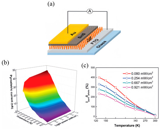 Conventional photodetectors relying solely on photovoltaic effects exhibit limited functionality in cryogenic environments due to their significantly degraded response at low temperatures. To address this limitation, Chang et al. [151] engineered a SnS/CdS heterojunction photodetector synergizing pyroelectric (temperature-induced polarization changes generating transient currents [152]) and photovoltaic effects. The device architecture comprised hydrothermally grown CdS nanorod arrays on FTO glass, overlaid with thermally evaporated SnS films and Au electrodes (Figure 11a). Temperature- and power-dependent analyses (Figure 11b) reveal enhanced pyroelectric currents with increasing optical power (0.08 mW cm−2) and decreasing temperature (300 → 130 K), demonstrating the effective substitution of carrier migration (photocurrent) with lattice-vibration-driven currents (pyroelectric) for low-temperature operation. Figure 11c quantifies this transition, showing pyroelectric dominance (Ipyro/Iphoto ratio increasing from 10% to 400%) under cryogenic, low-irradiance conditions. At 650 nm illumination, the device achieves 10.4 mA W−1 responsivity and 3.56 × 1011 Jones detectivity at zero bias, with sub 30 ms response/decay times. Complementing this approach, Ren et al. [86] developed self-powered p-n heterojunction detectors through the hydrothermal deposition of n-CdS nanorods onto p-Si substrates, capped with sputtered ITO/Ag electrodes. The devices exhibit a broadband response (405–1064 nm), with 64.8 mA W−1 responsivity and 1.31 × 1010 Jones detectivity at 2.55 mW cm−2, alongside rapid 190.8/298.4 μs response/recovery dynamics under zero bias. These dual-mechanism architectures establish new paradigms for extreme-environment photodetection systems.
