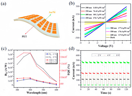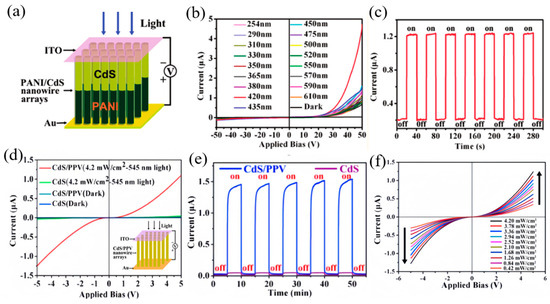 The ordered architecture of nanoarray configurations demonstrates significant advantages over isolated nanostructures through enhanced light-harvesting capabilities derived from expanded active areas. Liang et al. [133] employed metal–organic chemical vapor deposition (MOCVD) to fabricate vertically aligned ZnS nanoarrays (NWAs) on GaAs substrates. Figure 6a schematically depicts the single-nanowire device architecture, wherein Cr/Au electrodes are lithographically defined at both terminals of individual ZnS nanowires on silicon substrates. An analogous fabrication strategy was employed for the nanowire array (NWA) configuration, incorporating conformally deposited Au thin-film electrodes across the NWA surface (Figure 6b). Systematic photoelectronic characterization under 325 nm illumination quantitatively revealed divergent operational parameters: the individual nanowire device exhibited a photocurrent of 1.5 pA under 10 V applied bias (Figure 6c), whereas the NWA architecture generated a 508 pA photocurrent with substantially suppressed dark current at an applied bias of only 1 V (Figure 6d). Spectral selectivity testing at 442 nm confirmed minimal visible-light response, affirming its UV-specific detection capabilities. Cyclic switching stability measurements (Figure 6e,f) were conducted to quantify the temporal response characteristics. The nanowire array (NWA) device demonstrated superior reproducibility, operational stability, and significantly accelerated response speeds (tr = 5 ms, tf = 40 ms) compared to the single-nanowire device (tr, tf < 1.5 s), as evidenced by five consecutive illumination on/off cycles. The optimized NWA photodetector achieved exceptional figures of merit, including 1.87 A W−1 responsivity and 710% external quantum efficiency. This performance enhancement mechanism is mechanistically attributed to two synergistically coupled mechanisms: (1) interwire coupling phenomena that effectively suppress nonradiative recombination pathways; (2) vertically ordered nanoarchitectures acting as resonant photonic microcavities that enable enhanced photon localization through multi-scale light–matter interactions. When integrated with ultralow operational voltage thresholds and wafer-scale manufacturing protocols, these rationally designed nanoarray systems establish technologically promising platforms for implementing next-generation energy-autonomous optoelectronic device systems.