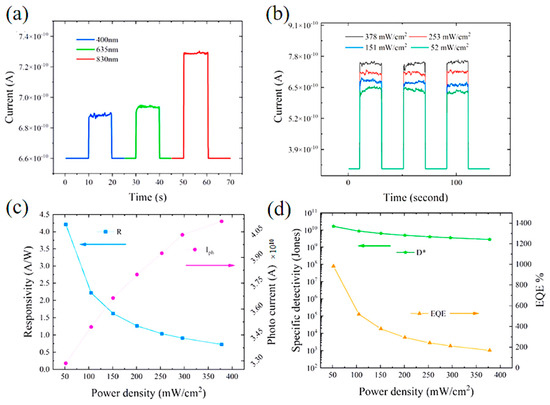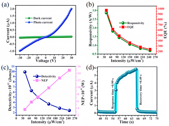 where Iph denotes the photocurrent, and Ilight and Idark are the currents obtained by the device under light and dark conditions, respectively.