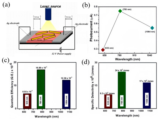Iph is defined as the ratio of photogenerated electron–hole pairs (e−-h+) collected by the electrode at the edge of the semiconductor. In a photodetector, the photocurrent is estimated by the following equation [63,64,65]: