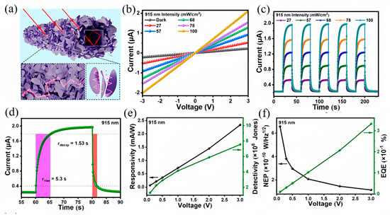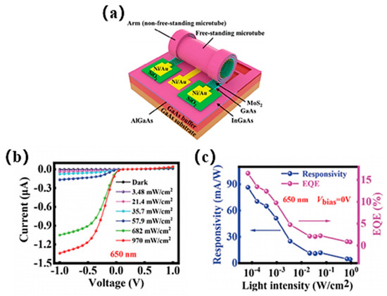 - Shen, M.; Wang, Q.; Liu, H.; Ye, H.; Yuan, X.; Zhang, Y.; Wei, B.; He, X.; Liu, K.; Cai, S.; et al. Self-Powered Polarization-Sensitive 3D Photodetector with Fast Response Enabled by Mechanically-Guided Assembly of Tubular MoS2/GaAs/InGaAs Heterostructure. Adv. Opt. Mater. 2025, 13, 2402848. [Google Scholar] [CrossRef]