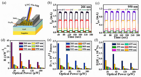 - Varshney, U.; Sharma, A.; Vashishtha, P.; Singh, P.; Gupta, G. Highly responsive self-driven broadband photodetector based on MoS2 nanorods/β-Ga2O3 heterojunction. Mater. Sci. Semicond. Process. 2023, 164, 107612. [Google Scholar] [CrossRef]