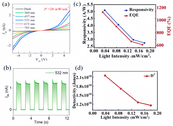 A photodetector is formally defined as an optoelectronic transducer demonstrating photoconductivity modulation within photoactive media under photon irradiation. Its configuration primarily consists of two functional elements: a photon-sensitive semiconductor matrix and metallic charge transport electrodes. The operational dynamics are predominantly dictated by interface potential barrier formation at Schottky junctions and specific device configurations. These mechanisms can include the photoconductivity effect [55,56], the photovoltaic effect [57,58], the photo-thermoelectric effect [59,60], and the pyroelectric effect [61,62], among others. Photon absorption with energy surpassing the detector’s bandgap triggers electronic transitions from valence to conduction bands, generating mobile charge carriers. Under intrinsic built-in or externally applied electric fields, these liberated electrons undergo directional long-range transport, while concomitant hole migration through valence band states enhances bulk conductivity. The resultant electron–hole pair dissociation enables electrode-collectable photocurrent generation, demonstrating intensity-proportional behavior relative to incident photon flux at operational wavelengths. Subsequent sections will systematically evaluate critical performance metrics encompassing photocurrent density, spectral responsivity (R), normalized detectivity (D*), external quantum efficiency (EQE), and temporal response dynamics.