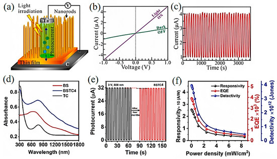 - Maria, C.C.S.; Patil, R.A.; Hasibuan, D.P.; Saragih, C.S.; Lai, C.C.; Liou, Y.; Ma, Y.R. White-light photodetection enhancement and thin film impediment in Bi2S3 nanorods/thin-films homojunction photodetectors. Appl. Surf. Sci. 2022, 584, 152608. [Google Scholar] [CrossRef]