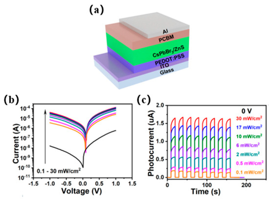 - Gao, Z.; Chen, L.; Li, S.; Pan, X.; Liu, Y.; Gao, G.; Zou, B. Type-II CsPbBr3/ZnS Heterostructured Nanocrystals for High-Performance Self-Powered Photodetector. ACS Appl. Nano Mater. 2025, 8, 5623–5631. [Google Scholar] [CrossRef]