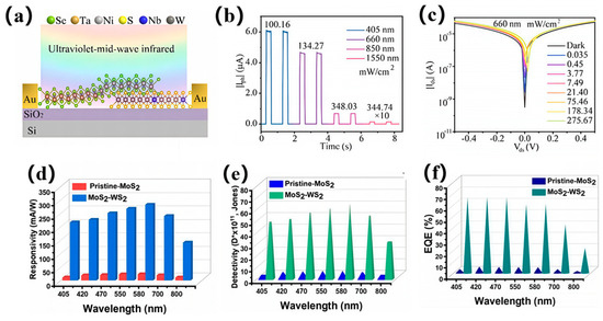 - Kumar, A.; Chakkar, A.G.; Das, C.; Kumar, P.; Sahu, S.; Saliba, M.; Kumar, M. Self-Powered Broadband Photodetectors Based on WS2-Anchored MoS2 with Enhanced Responsivity and Detectivity. Small 2025, 21, e2502900. [Google Scholar] [CrossRef]