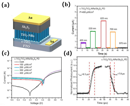 - Kang, Y.; Deng, H.; Wu, K.; Wang, G.; Hong, J.; Wang, W.; Wu, J.; Zhou, H.; Xia, Y.; Cheng, S. Self-powered Sb2S3 photodetectors with efficient carrier transport enabled by compact vertical TiO2 nanorods. Opt. Lett. 2024, 49, 6533–6536. [Google Scholar] [CrossRef]