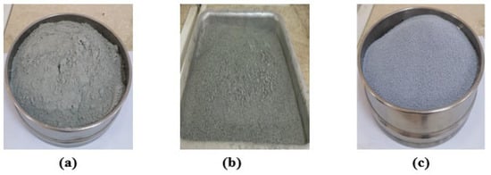 Around 100 kg of the sample was taken from the primary stockpile for laboratory analysis to investigate the physicochemical characteristics. In the lab, samples were screened using sieves with openings of 12.5 mm or larger. As depicted in Figure 5, any material exceeding 12.5 mm was designated for use as coarse aggregate. The crushing proceeded until 95% of the particles could pass through a 12.5 mm sieve, achieving a P95 value of 95%. In this research, the fine aggregate was sorted into three size categories: coarse recycled sand that fits through a 4.75 mm sieve, medium recycled sand that passes through a 4.75 mm sieve but is held by a 2.36 mm sieve, and fine recycled sand that goes through a 2.36 mm sieve but is retained by a 1.18 mm sieve.