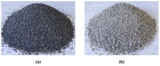 The second fine aggregate, recycled sand (R-Sand), was developed from demolished concrete samples from multiple sites. These chosen samples of demolished concrete must comply with the strength standards specified by []. The concrete samples that fulfilled the specified criteria in [] were collected and subsequently crushed at the aggregate processing facility of Abdin Construction Company. In Figure 2, part (a) displays M-Sand, while part (b) presents R-Sand.