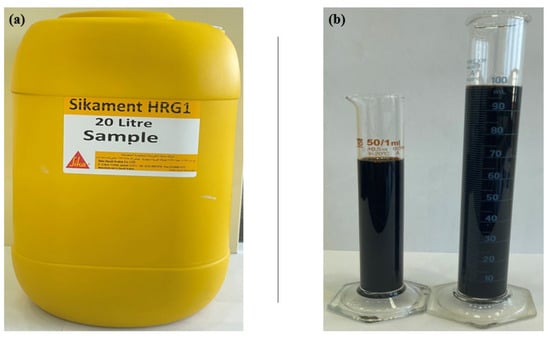 As per the standard [], the slump-maintaining admixture was utilized to maintain the 100 mm slump for all prepared mixes of this study. Figure 4a,b show F-type water-reducing, high-range admixtures (20 L container) with measuring cylinders.