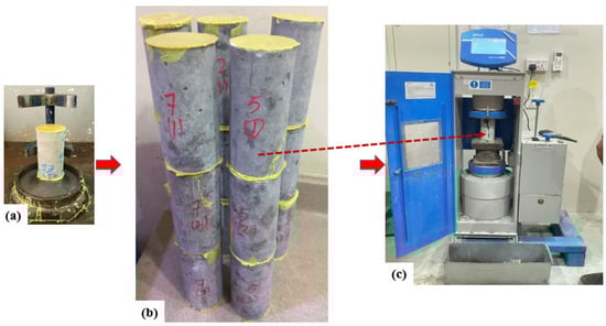 In this research, various trail mixes were prepared to assess the strength and longevity of modified sustainable concrete. A reference mix, natural aggregate concrete (NAC*), used entirely natural components with 100% OPC to benchmark against the sustainable concrete developed in this study. Four distinct concrete mixtures were developed, incorporating fly ash, silica fume, and recycled sand (FASFRSC). Each mix contained different amounts of fly ash (ranging from 5% to 20%), silica fume (10%), and a combination of recycled and manufactured sand (50% R-sand + 50% M-sand). These mixes were labeled as 5FASFRSC, 10FASFRSC, 15FASFRSC, 20FASFRSC, and 25FASFRSC, respectively. The study involved replacing river sand entirely with a (50% R-sand + 50% M-sand) blend. Table 2 presents the designations for sustainable concrete mixes and specifies the quantities employed for each mix. The strength of cylindrical specimens under both compression and tension was measured using a compression machine with a capacity of two thousand kN and a universal tensile testing machine with a capacity of one hundred kN. Figure 6 illustrates the arrangement used to determine the compressive strength of concrete formulations. The process of preparing the samples with a sulfur cap is depicted in Figure 6a. Figure 6b,c display the prepared samples and the samples under testing. The flexural strength experimental setup is presented in Figure 7. Figure 7a,b show the beam sample in testing and the dimensions of the sample as per the standard requirement of [].